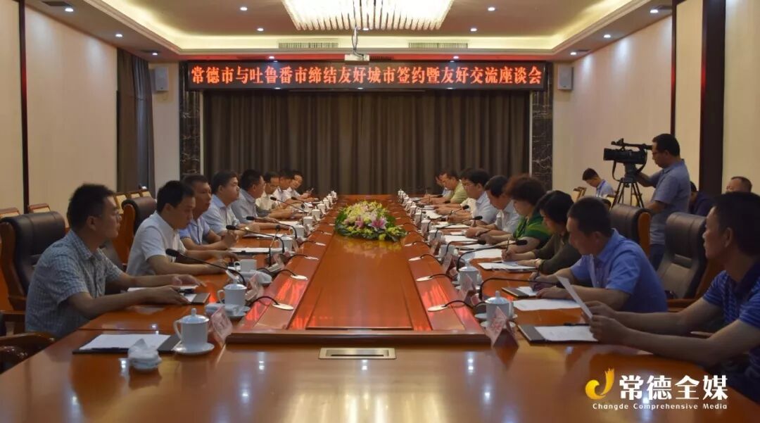 红网时刻综合 据常德电视台报道 9月2日下午,常德市与吐鲁番市缔结友好城市签约暨友好交流座谈会在吐鲁番市举行。受曹立军市长的委托,副市长龚德汉代表常德市人民政府与吐鲁番市市长买买提明·卡德签署了友好城市协议。
