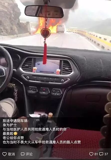片刻惊吓后,身为护士的周炜,也立即加入了救援队伍。冒着车辆爆炸的危险,她和几位素不相识的游客一起从起火的车辆中“抢人”!来自天南海北的陌生人,齐心协力把两辆车上的乘客一个一个地从车里抢出来。