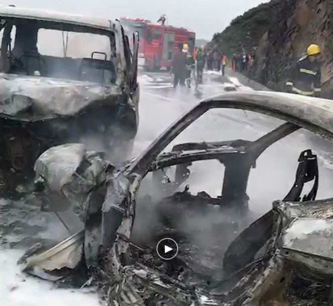 两辆事故车烧成骨架。