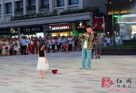 晚上8点半,武陵阁步行城的中央喷泉处人头攒头。人群中,一个小女孩走向了街头表演者,并投下一枚硬币。随之,小提琴独奏《欢乐颂》的音乐声响起。