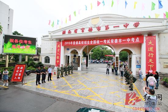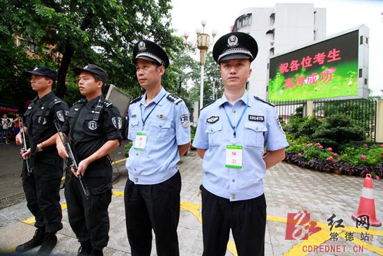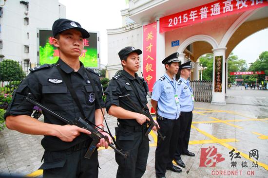 在考点常德市一中门口,数十位公安特警人员站岗护航高考。