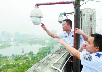 6月25日,城管工作人员在调试白马湖公园附近制高点的监控设施。今年来,常德市武陵区城市管理监督指挥中心在该区重点地段安装了50个高清视频监控装置,通过视频智能分析技术,可以达到无人值守自动上报城市管理有关情况。陈自德 摄