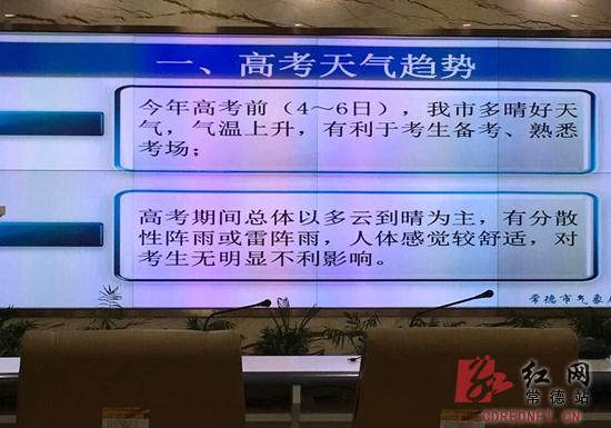 红网常德站6月3日讯(记者 黄刚 实习生 禹梨 ) 高考期间,常德地区天气情况如何? 6月3日,常德市气象局召开高考期间天气情况新闻发布会,今年高考期间天气总体以多云为主,后期有分散性阵雨或雷阵雨,人体感觉舒适,对考试无明显不利影响。