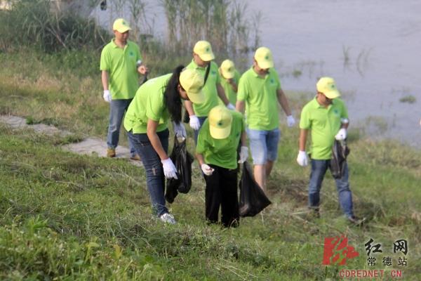 在县城沿河大堤十多里大堤两侧,四十多名志愿者手拿火钳、垃圾袋捡拾拉圾。正值烈日当空,酷署逼人,志愿者三五人一组,仔细寻找河洲上草丛里的垃圾。
