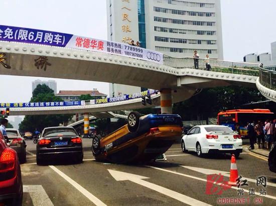 红网常德站6月6日(记者 郑江晖)今天中午12点左右,在常德市城区朗州路丹阳天桥段,一辆出租车失控撞上一辆小车,翻个“四脚朝天”,还引发了连环追尾。所幸的是,此次事故并未造成较大人员伤亡。目前,事故原因正进一步调查中。