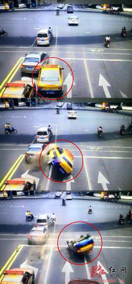 事发在红绿灯路口,什么原因导致车辆翻个“四脚朝天”?该出租车司机聂师傅被过往路人从车厢救出来后,仍惊魂未定,“我自己也不知道,现在都是懵的。”随后,记者也查看了监控视频,事发时,这辆出租车在朗州路南往北方向骑着白色实线快速行驶,突然失控,径直撞上左转道上等红灯的小车,发生翻车“四脚朝天”,而被撞的小车前方的一辆面包车和一辆电动车,也遭遇了连环追尾。