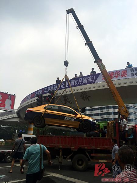 记者在事故现场看到,出租车“四脚朝天”横在路中,前挡风玻璃破碎,车头、车门受损严重,施救吊车正将翻倒的出租车吊装运走,由于事故车辆占据由南往北两个直行车道,导致该路段交通拥堵。至下午1点30分左右,事故车辆被运走,该路段交通才恢复畅通。