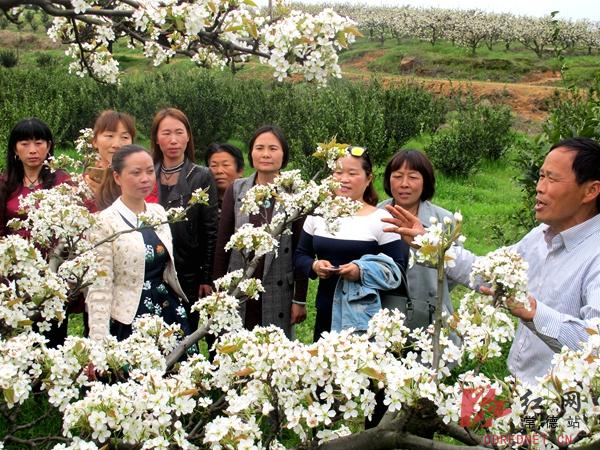 田金堂(右一)正在向春赏梨花的游客介绍打造千亩生态果园的发展前景