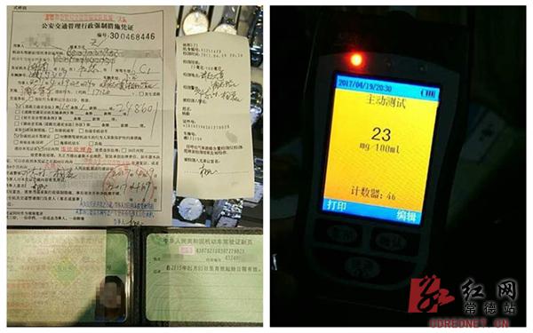 当晚,直属一大队一中队民警在常德城区武陵大道湘北路口处设卡开展酒驾专项整治行动。晚上8时30分左右,一辆牌号为湘JJ31××的灰色福克斯小型汽车进入了民警的视线,司机是一位女性,约30多岁。民警上前例行检查,将车辆拦停后,要求驾车女子进行吹气酒精测试。女子拒不配合交警的测试。在民警的强烈要求下,该女子做了吹气测试。经检测,该女子酒测值为23mg/100ml,达到酒驾标准。
