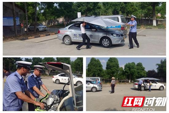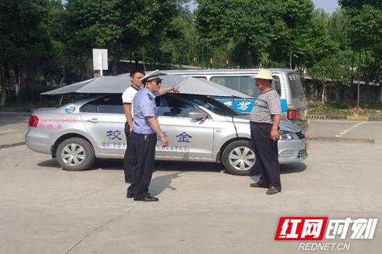 红网时刻常德5月18日讯(通讯员 马辉)天气炎热,部分教练车为避免阳光直射,在车上加装了遮阳伞,殊不知,这种改装是极其危险的,为规范驾驶员培训程序,确保学员安全。5月17日下午,常德交警直属二大队集结力量,对辖区金鹰驾校、环旅驾校、金龙驾校三所驾校非法改加装遮阳伞的违法行为进行了严管严查。