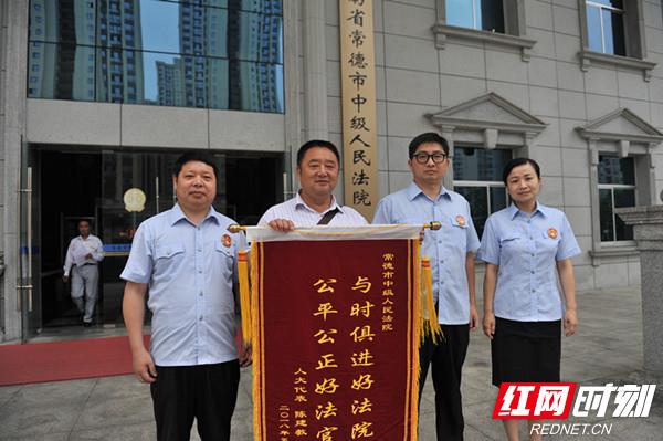 红网时刻常德5月23日讯(通讯员 左龙 张利)5月21日,全国劳动模范、市人大代表陈建教及当事人等来到常德市中级人民法院,将一面绣有“与时俱进好法院、公平公正好法官”的锦旗送到了民一庭的法官手中,对该院公平公正办案给予了高度评价。