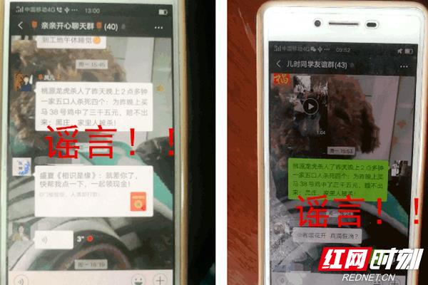 红网时刻常德6月5日讯(记者 郑江晖)6月4日,常德市澧县公安局发布消息,称6月1日凌晨,该局网络安全保卫大队的民警接到常德市公安局的转警,发现在微信上有人传播“桃源龙虎发生一起杀人案”的信息,经民警迅速核查,该信息不属实,系谣言。