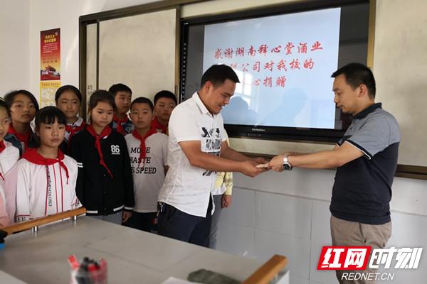 红网时刻常德6月6日讯(通讯员 吴林芳)6月5日,湖南释心堂酒业有限公司为武陵区三村小学捐赠1万元现金,这笔善款用于该小学基础设施建设、教师培训等。图为捐赠现场。