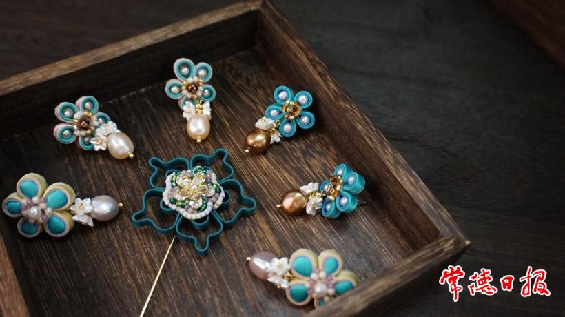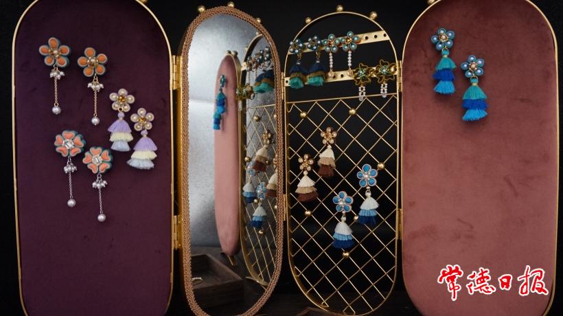 “桃花灼灼”品牌产品在制作上保留非遗盘扣工艺流程,用常德城市文化赋能创新产品使用形式,使盘扣应用更加日常化、多样化,主营产品类型为胸针、耳饰、汽车挂饰、室内装饰画等,以“城市元素+本地取材”形式拉动地方经济,主要盈利方式为售卖产品、体验活动、培训课程。同时,运用工业机器人生产、电商直播销售等形式,激活传统工艺的时代生命力,在保护传统文化的同时推动创新发展。目前,项目品牌已完成商标注册,产品受邀参展湖南省旅博会,取得专利3项。