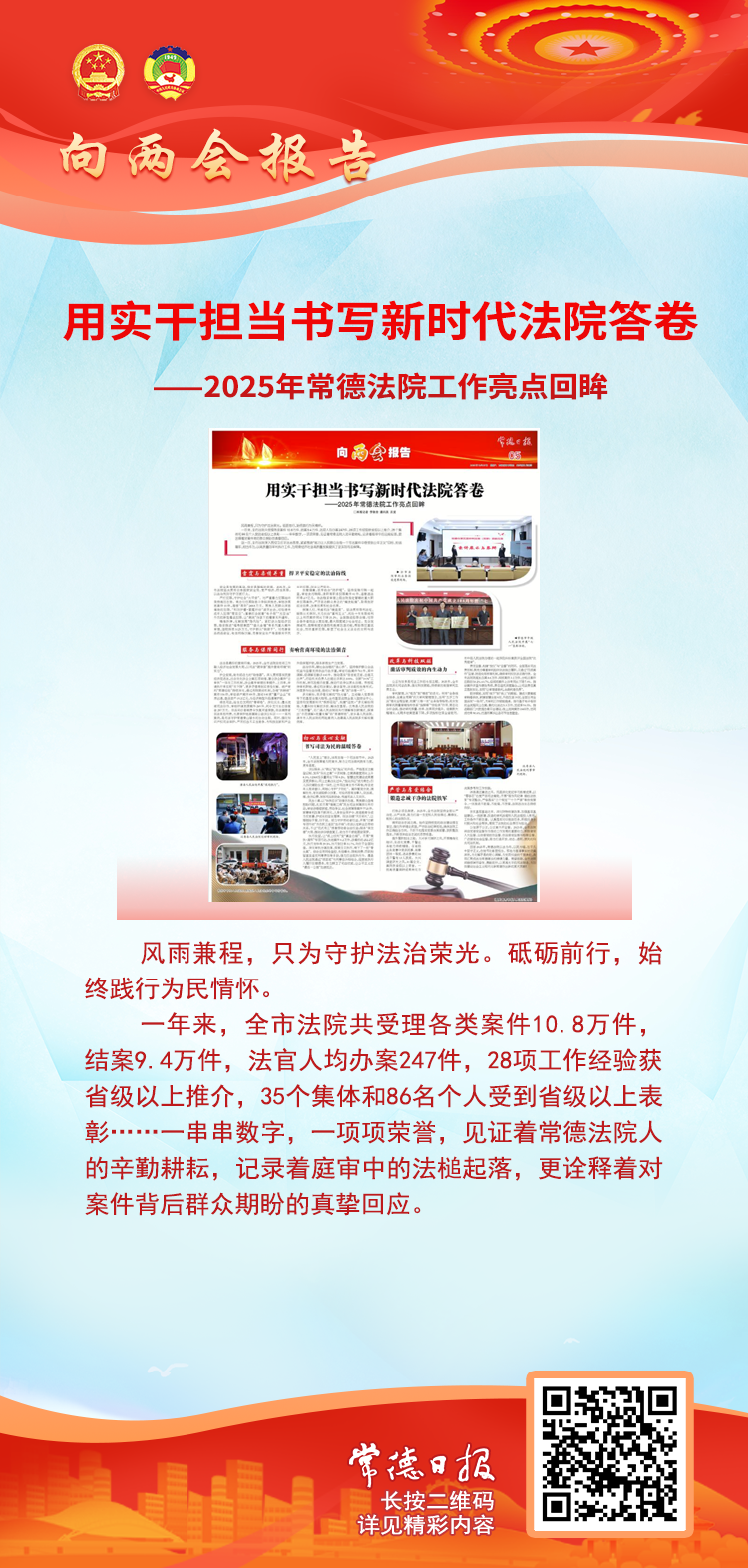 回首2025年,常德法院以法为舟,以民为锚,在平凡中坚守正义,在细节处彰显担当。那些为厘清事实的伏案深夜,为化解矛盾的耐心调解,为兑现权益的千里奔赴,共同汇聚成法治常德建设的磅礴力量。展望前路,全市法院将继续踔厉奋发、勇毅前行,以更高水平的司法服务,为加快建设社会主义现代化新常德作出新的更大贡献!